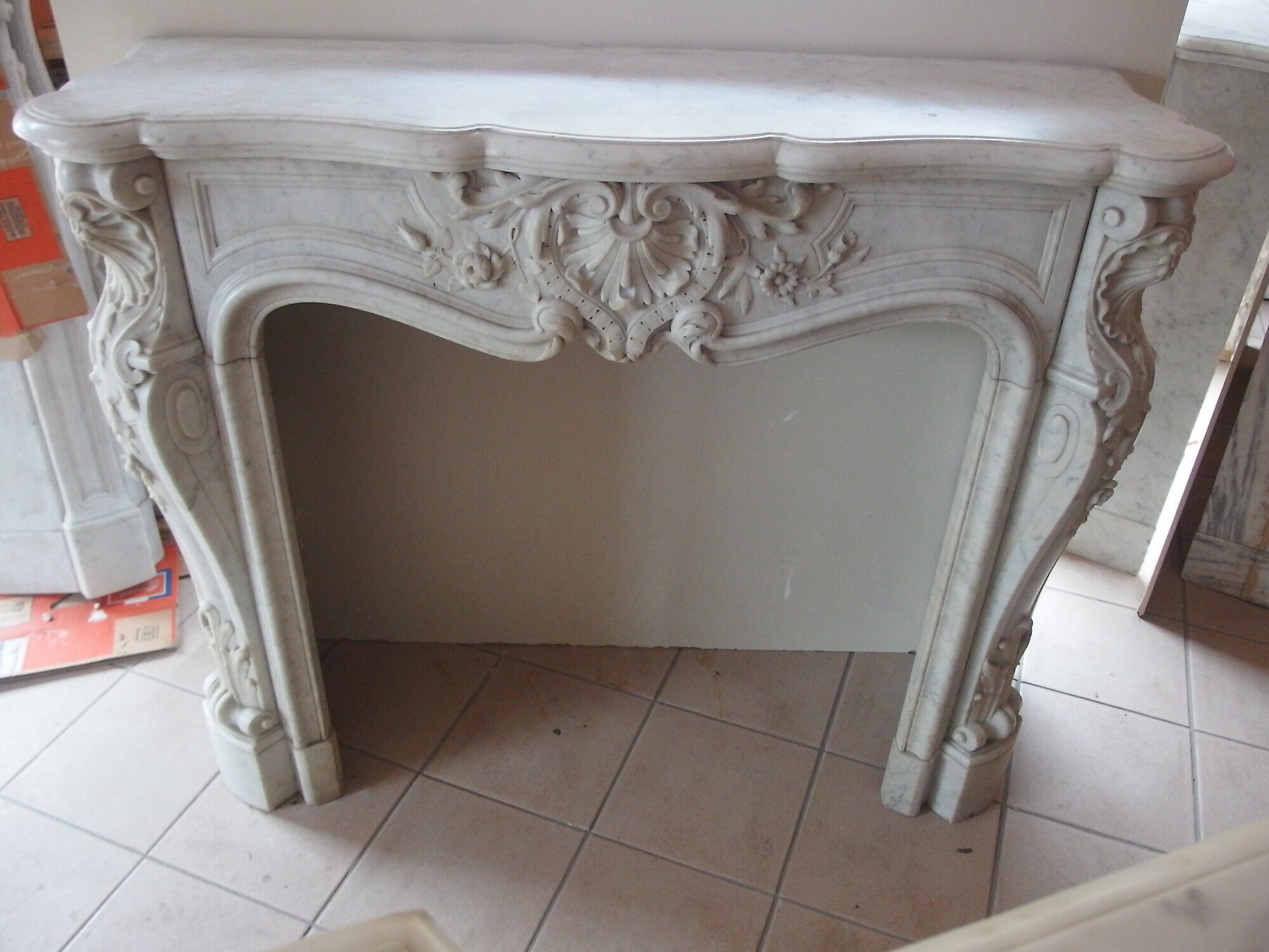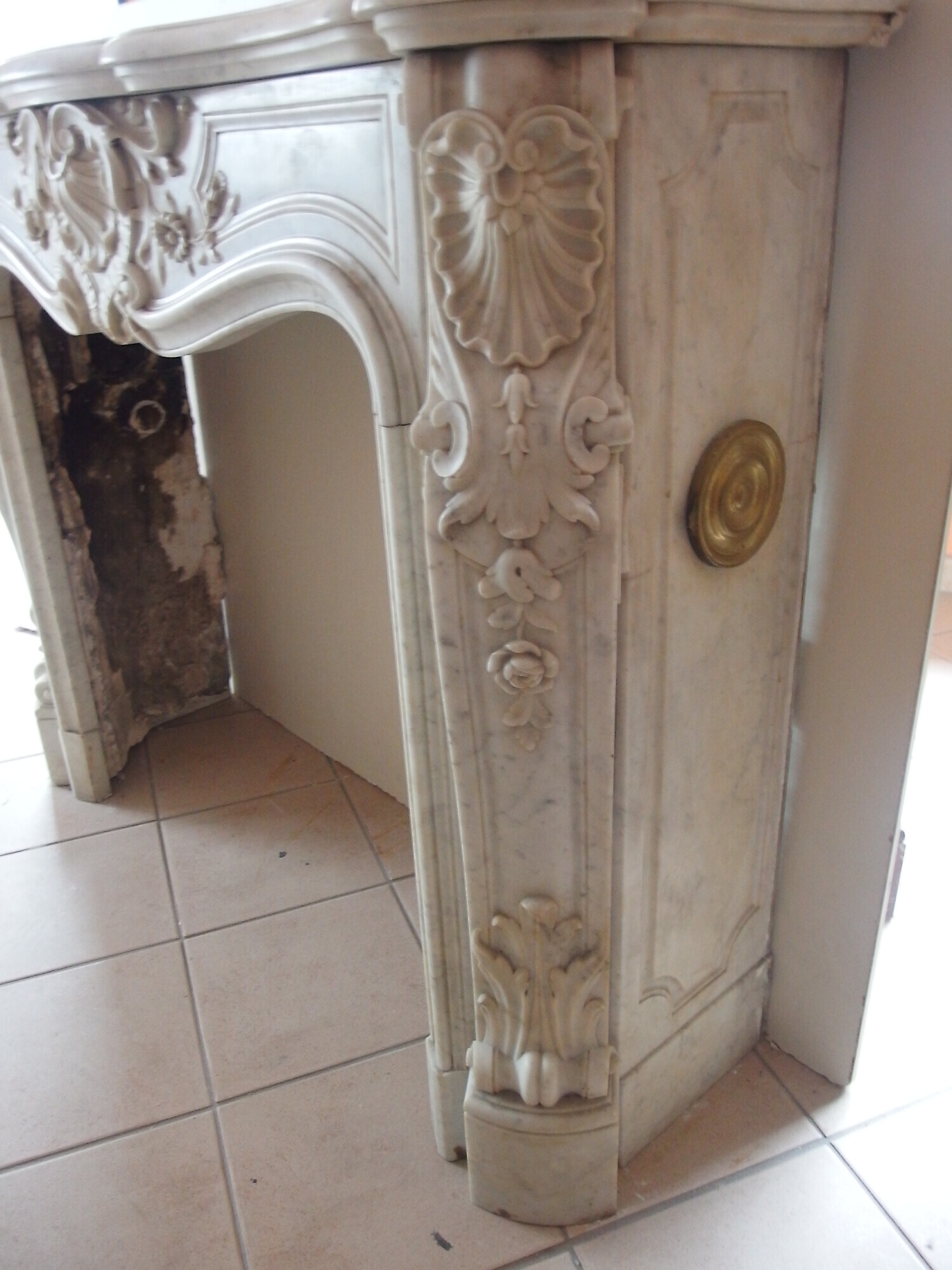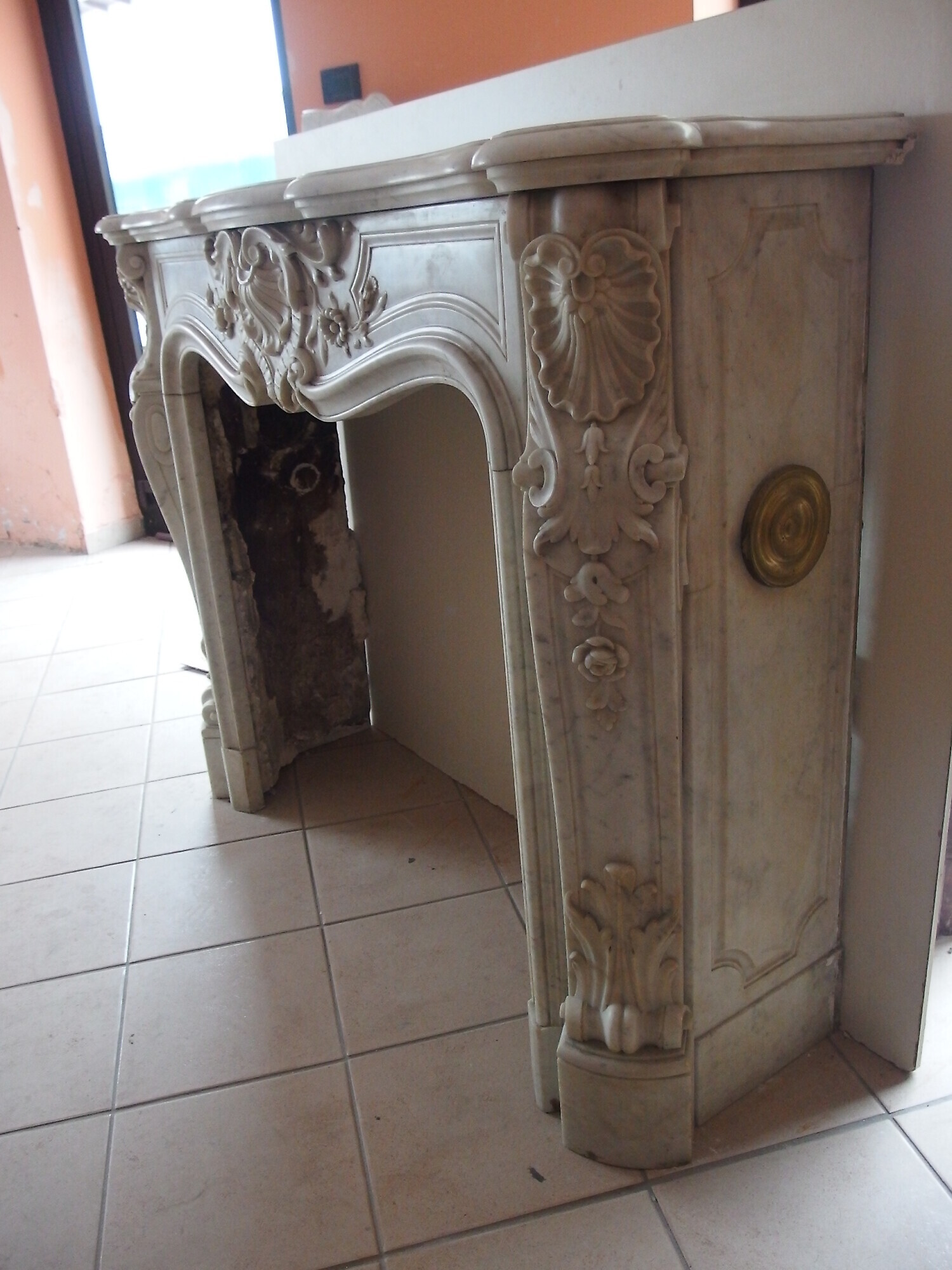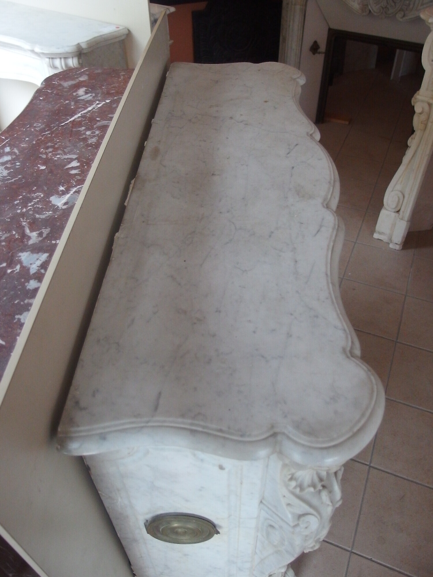 Bellissimo camino scolpito di piccole dimensioni in marmo bianco di Carrara stile Luigi xv epoca 800 di origine francese.