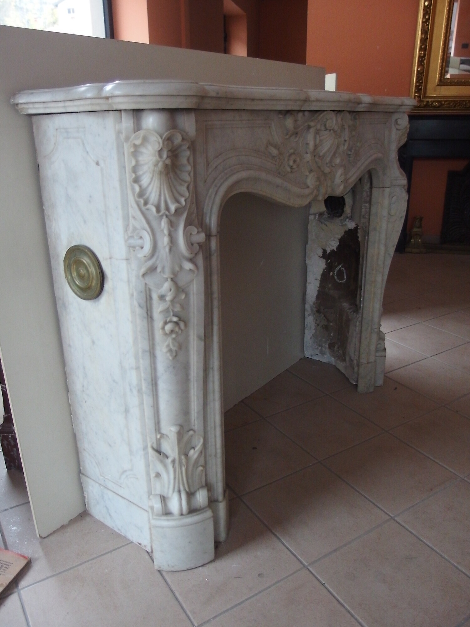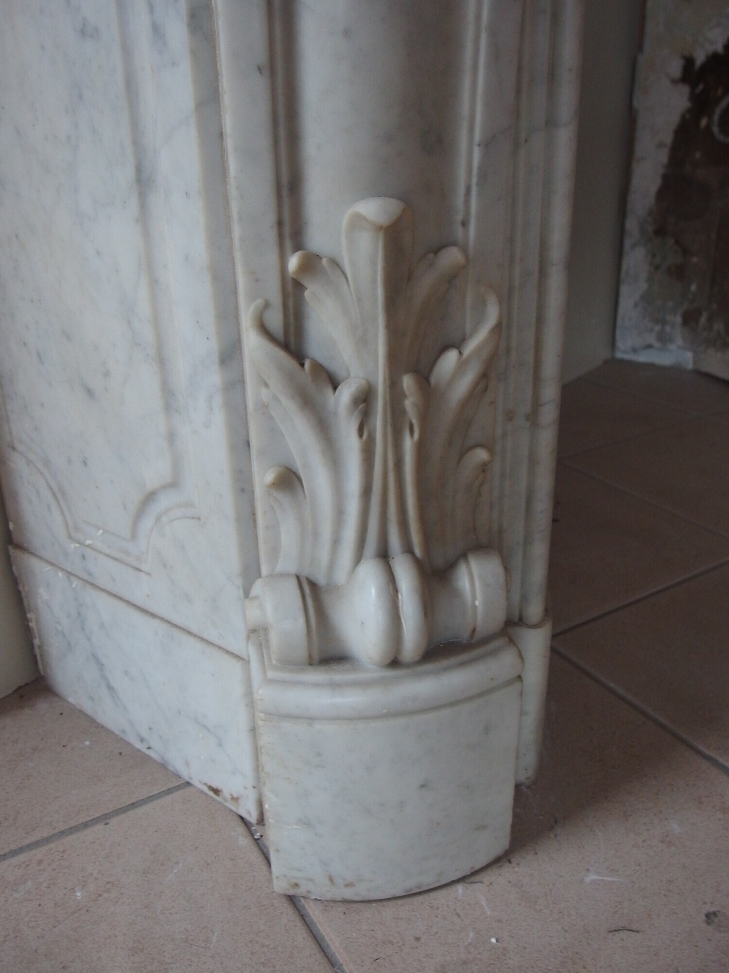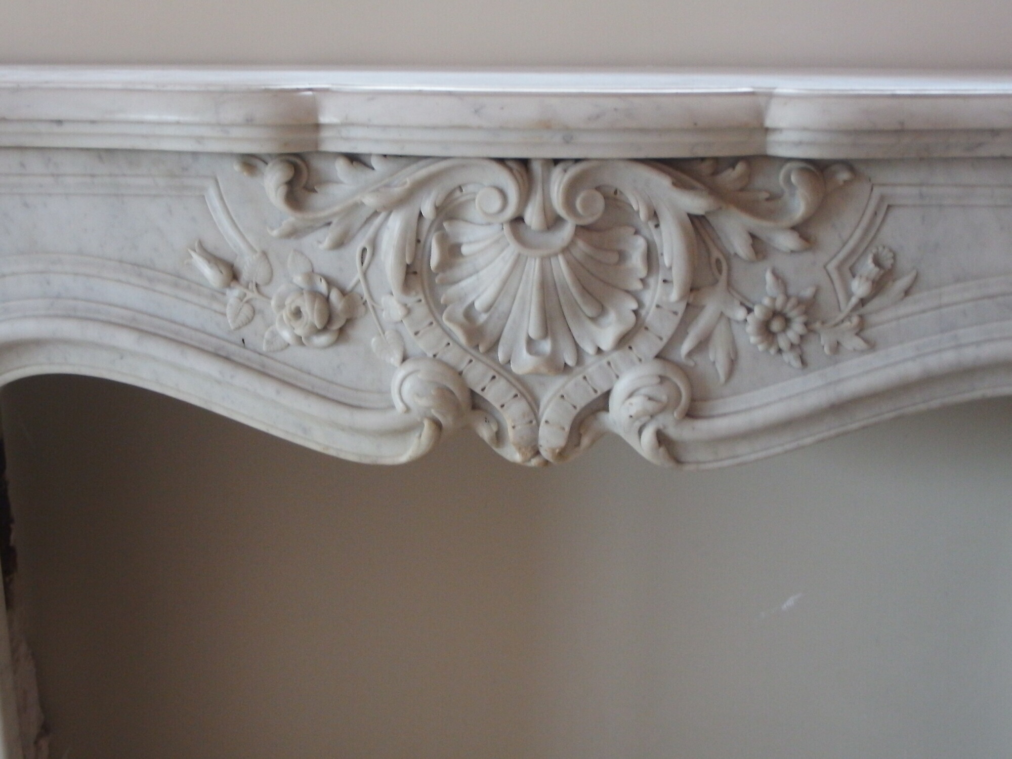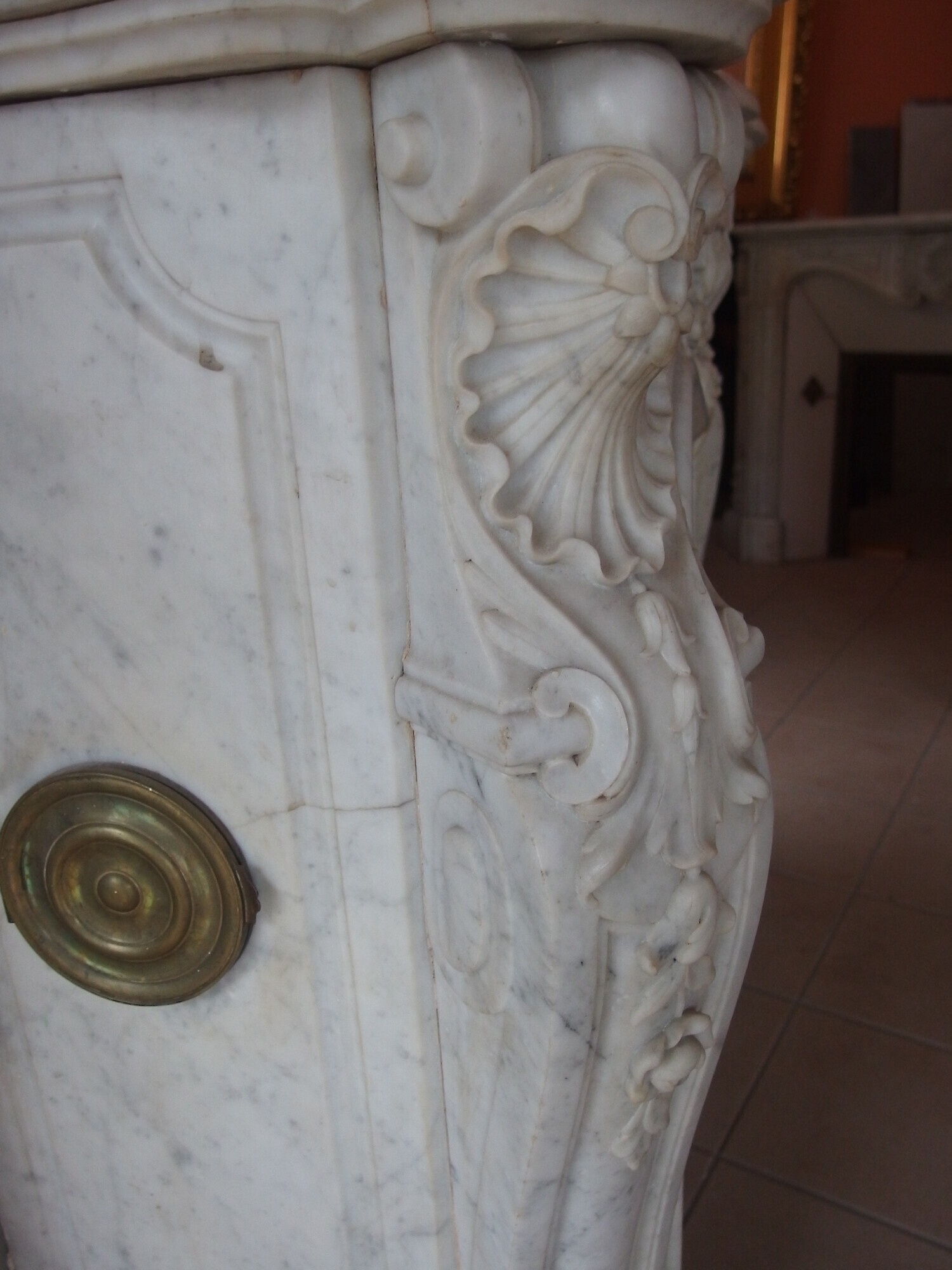 Bellissimo camino scolpito di piccole dimensioni in marmo bianco di Carrara stile Luigi xv epoca 800 di origine francese.