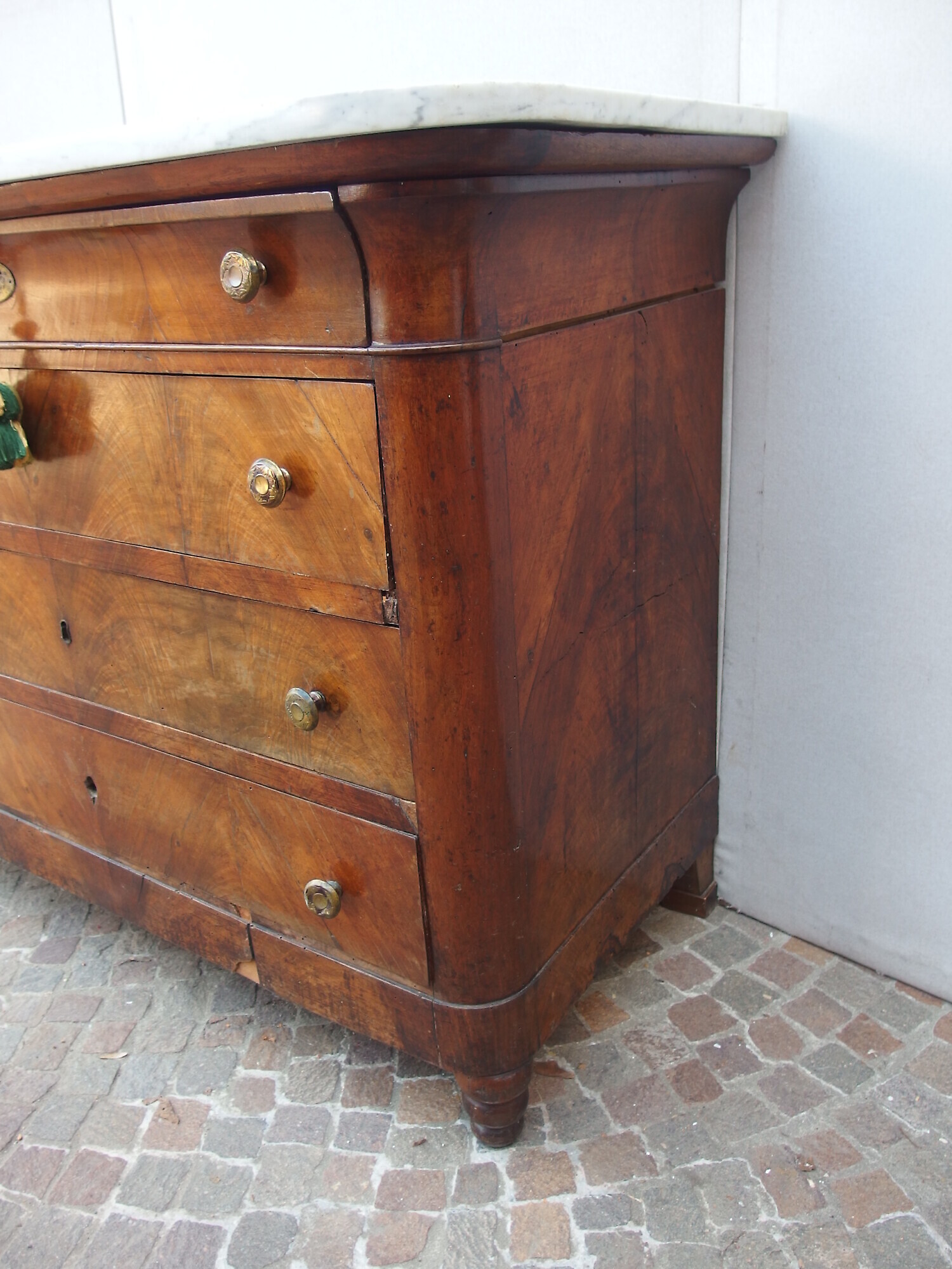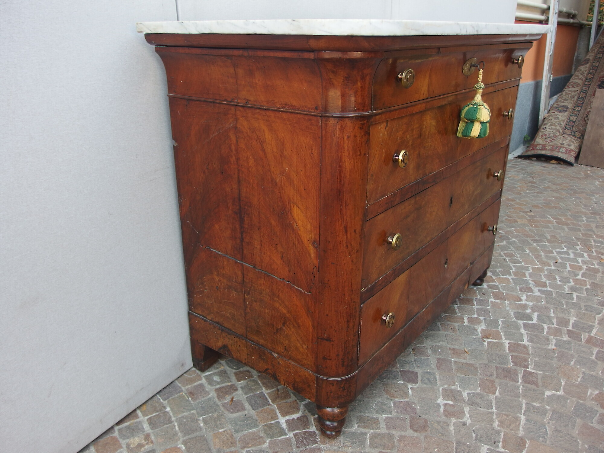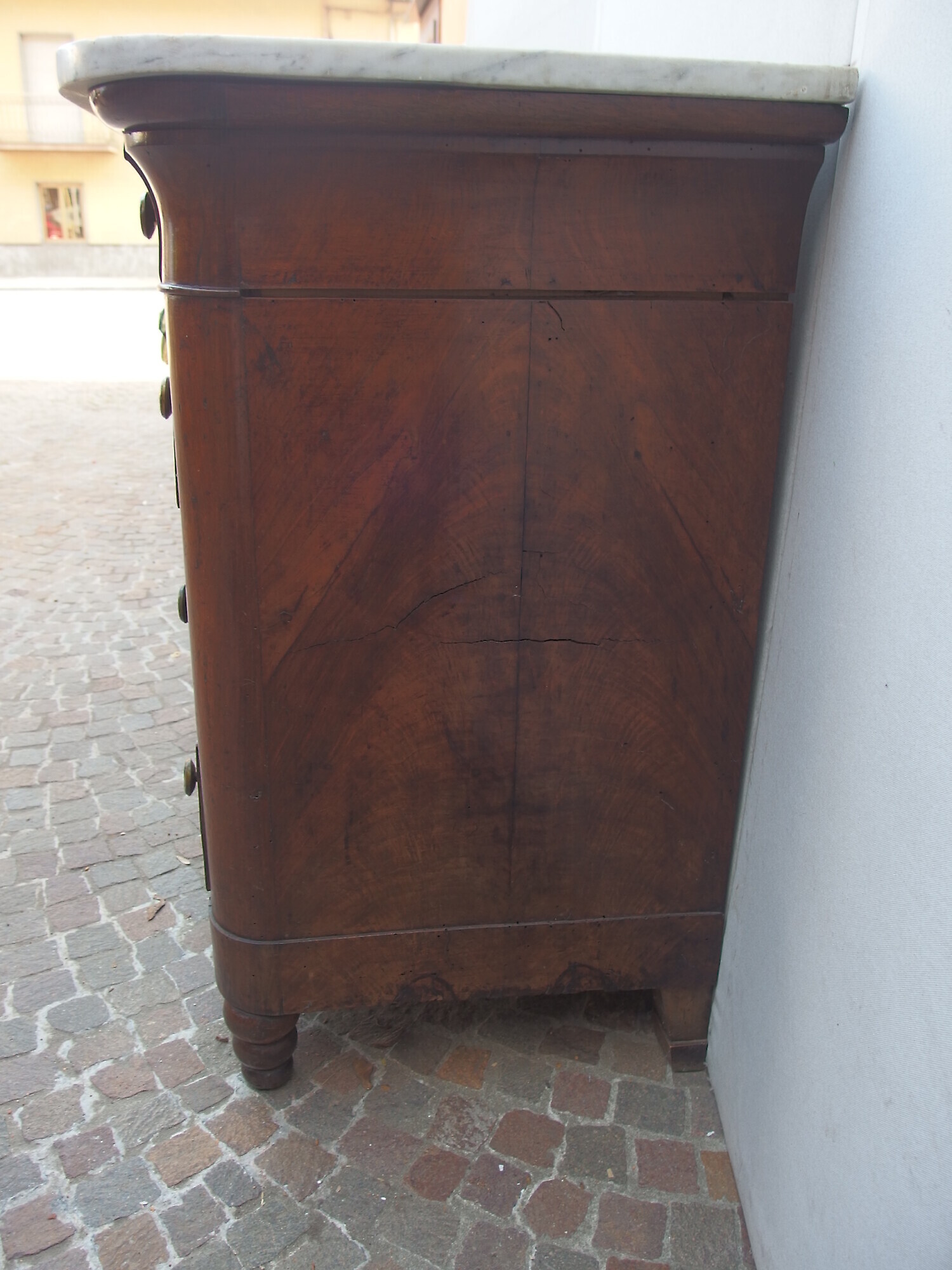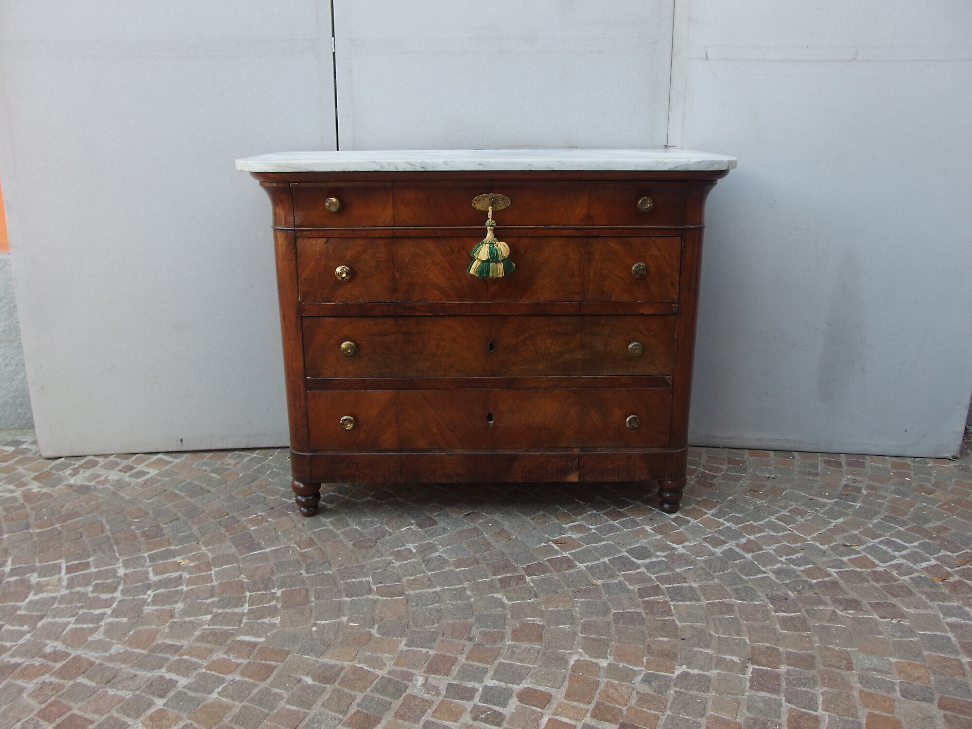 Bellissimo cassettone piemontese lastronato in piuma di noce stile Carlo X epoca primi 800 di origine piemontese.