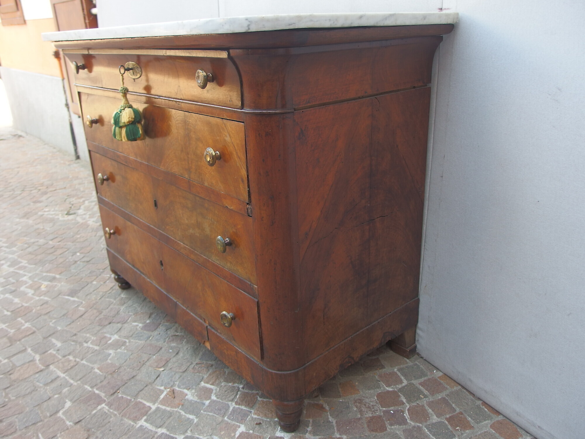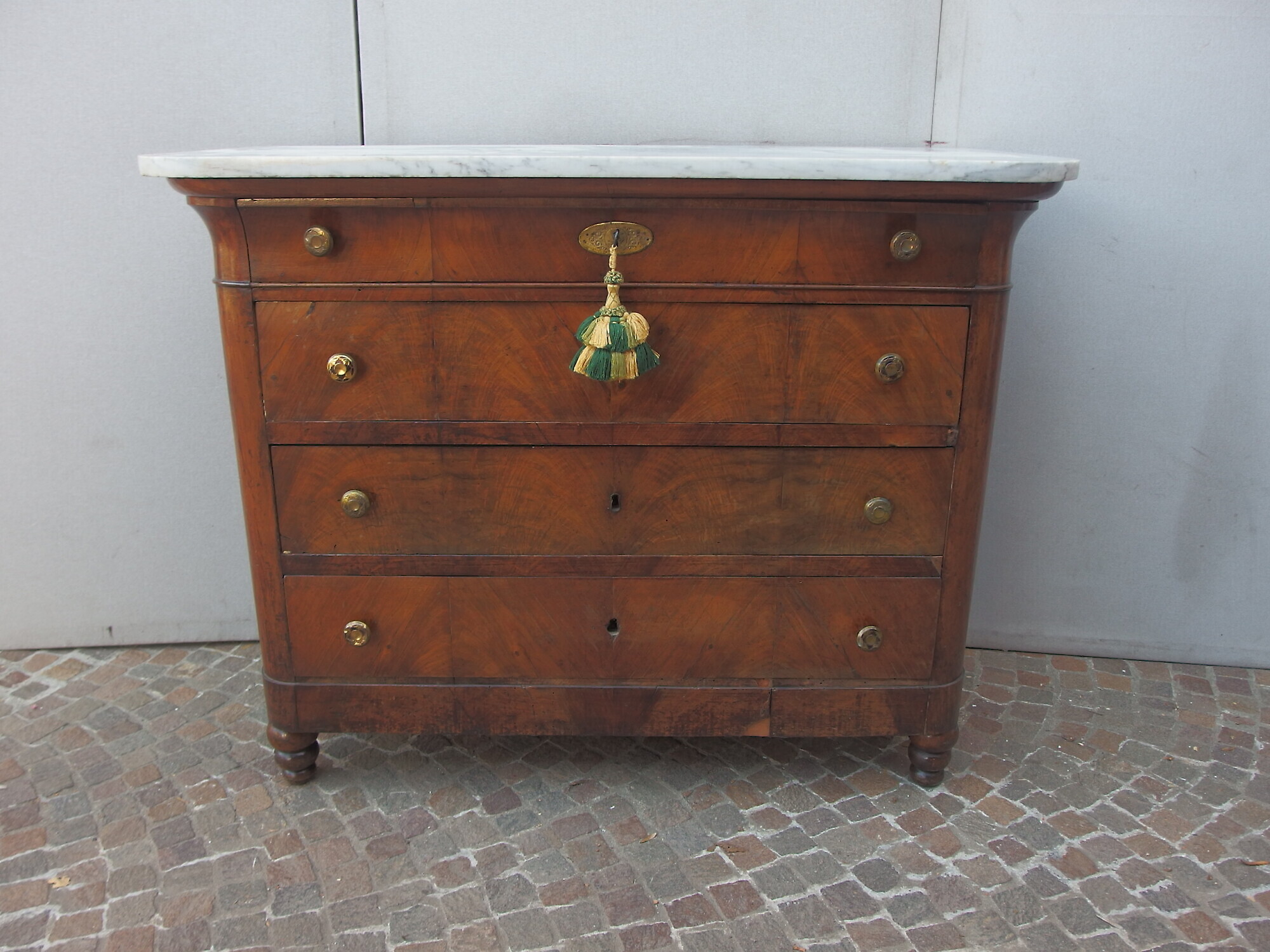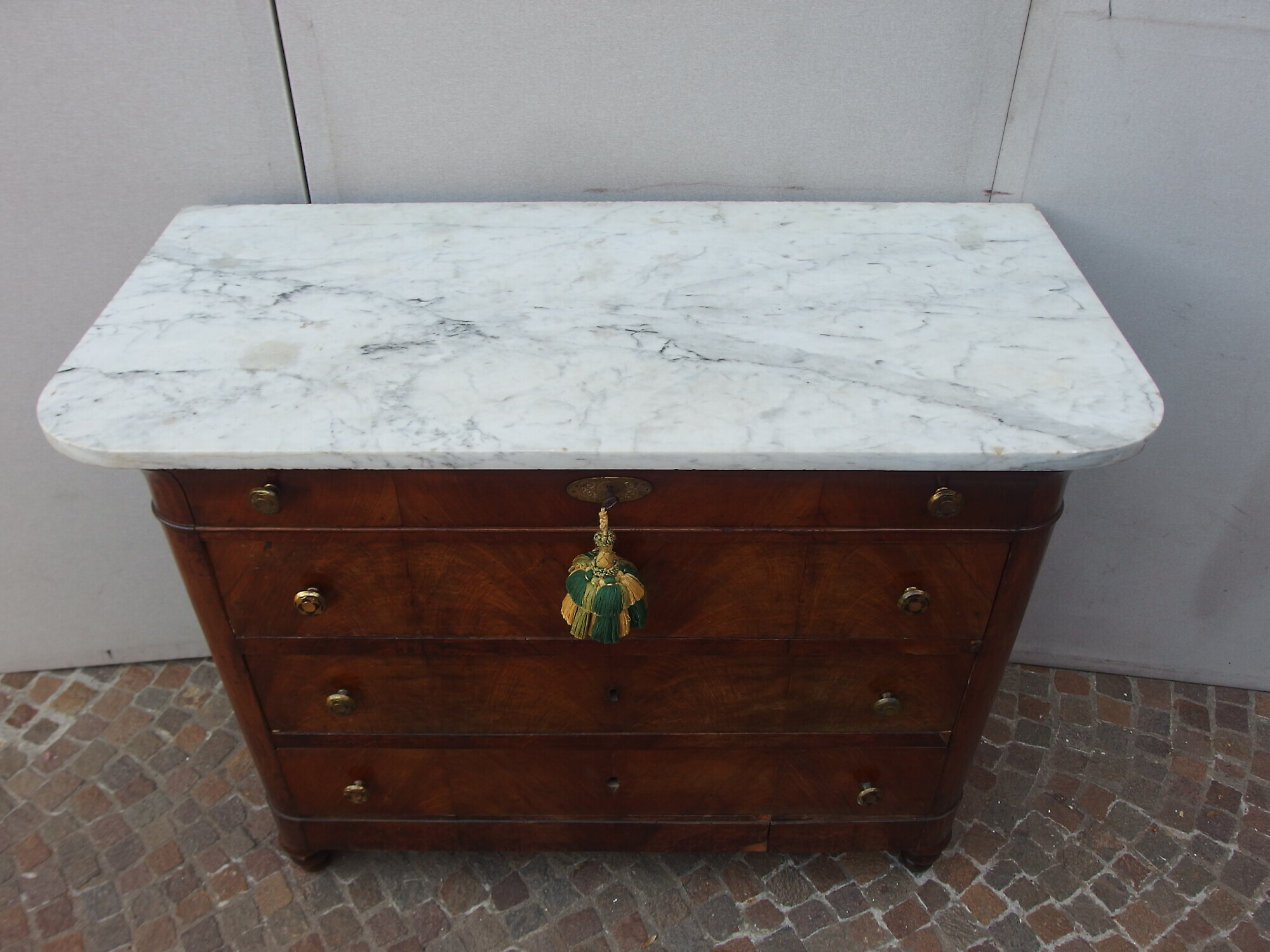 Il cassettone è completamente originale (vedi foto) il piano del cassettone è provvisto di lastra in marmo bianco di Carrara senza rotture. Completo di pomelli e serrature