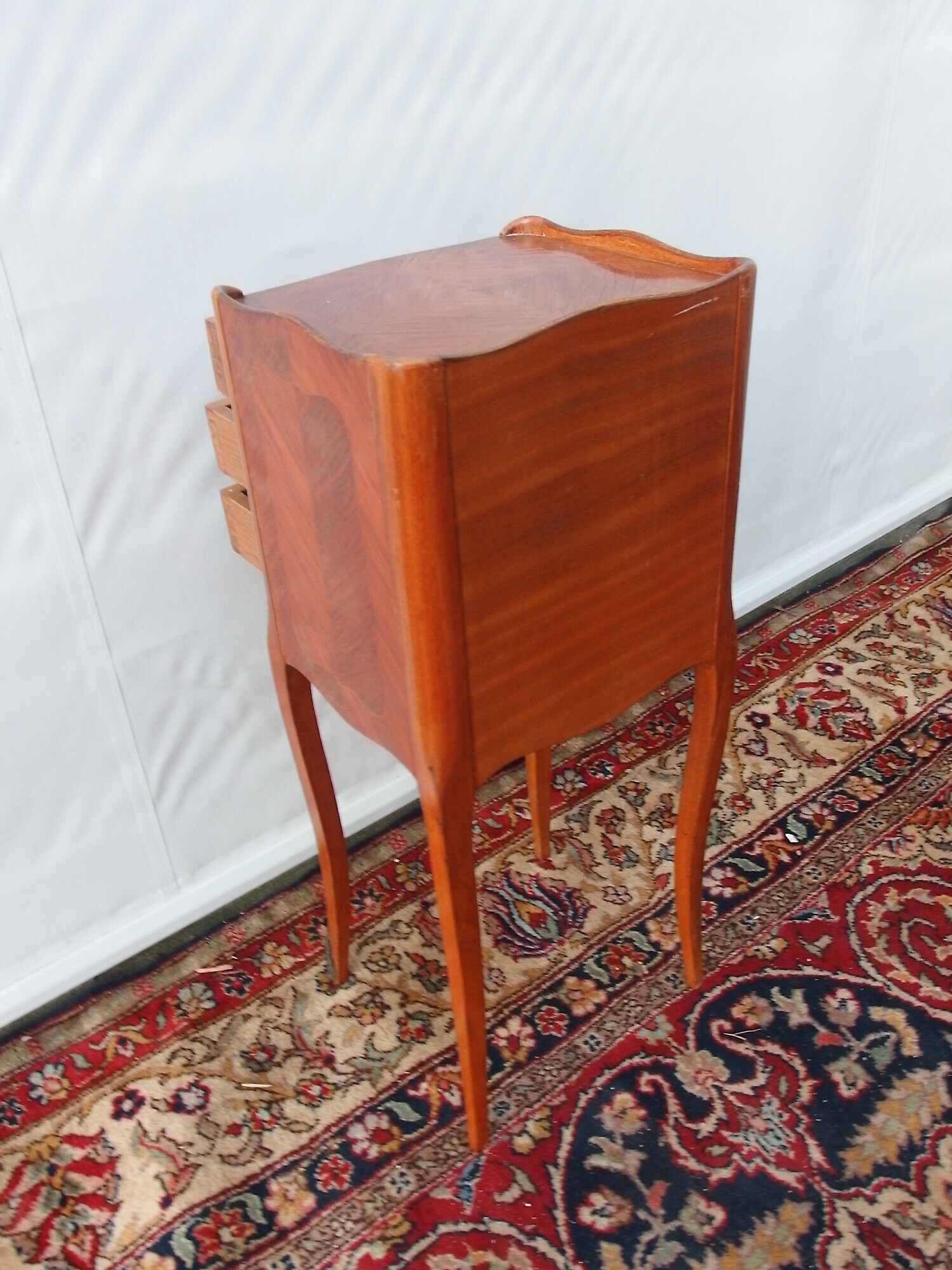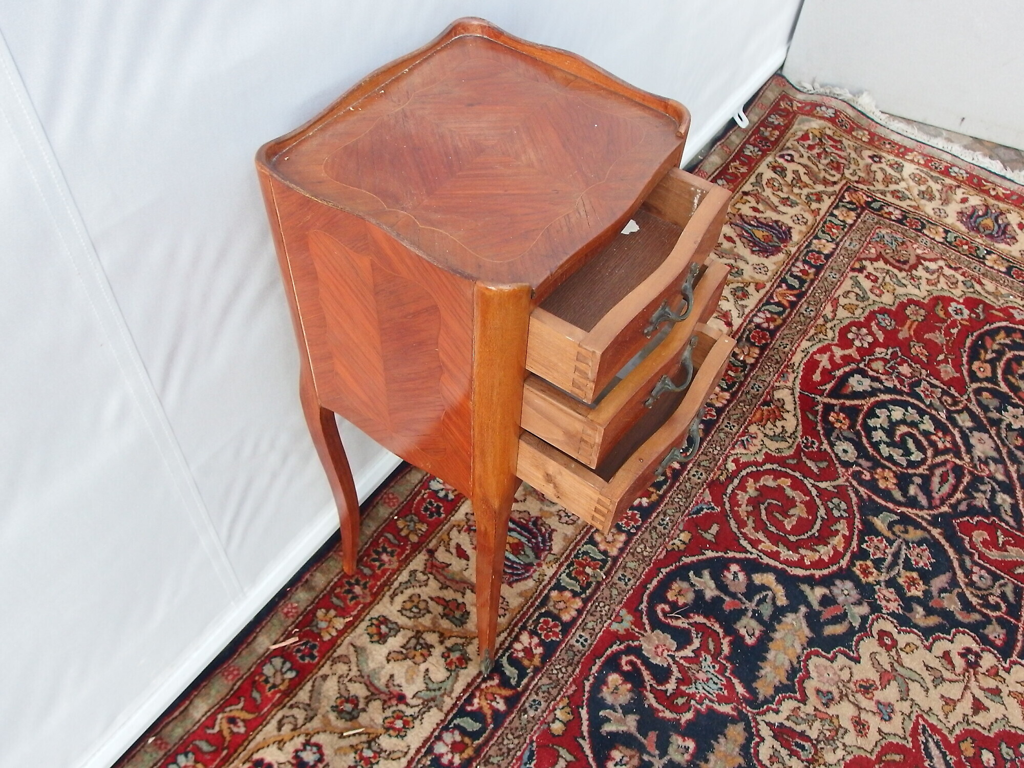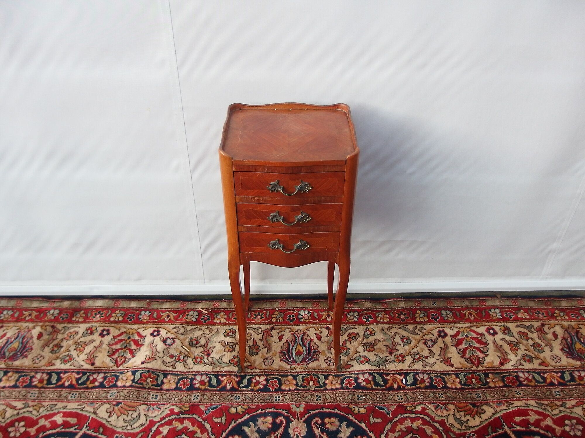Simpatico comodino di piccole dimensioni a tre cassetti stile Napoleone III intarsiato in legno di rosa epoca primi 900 di origine francese.