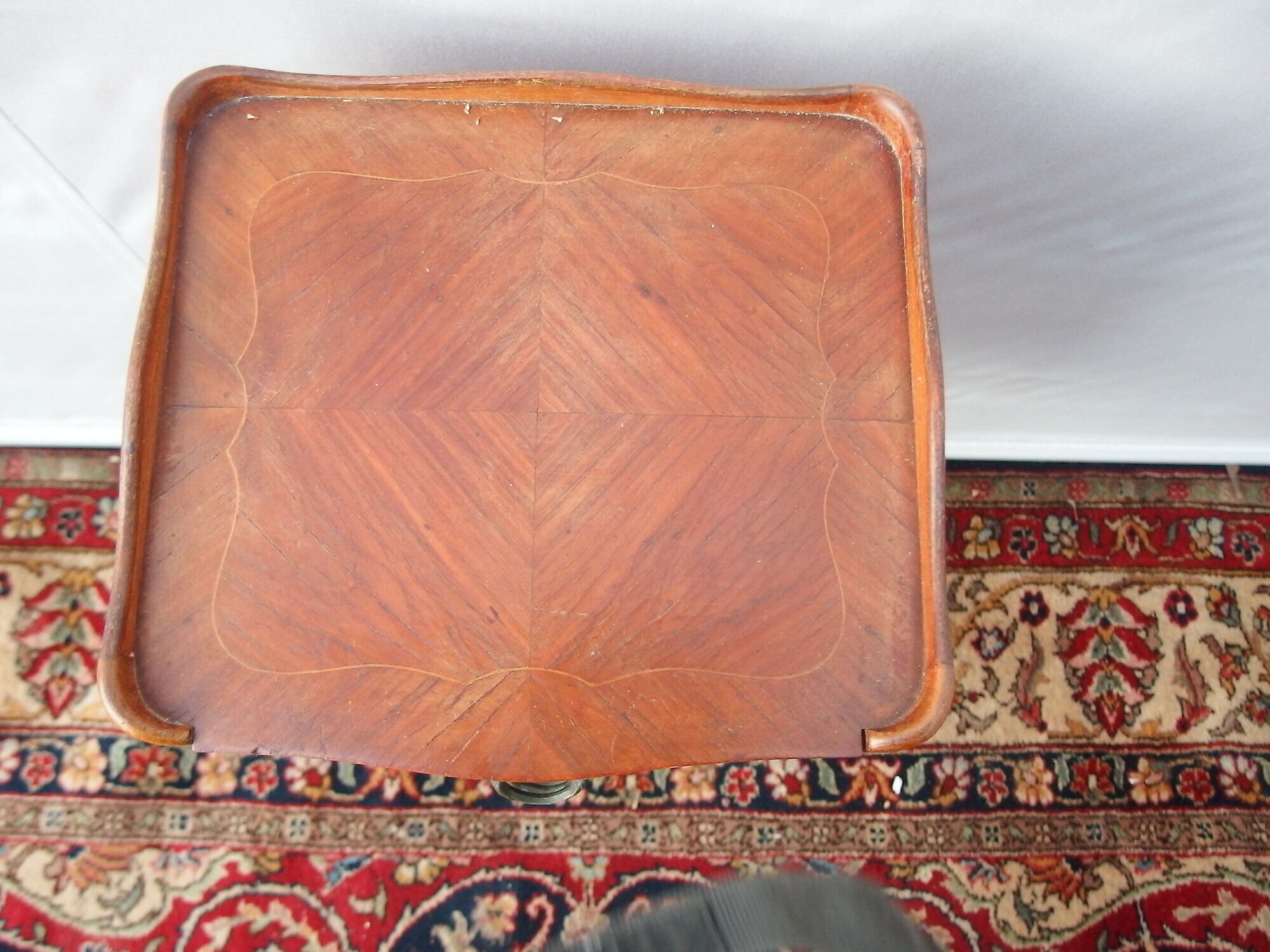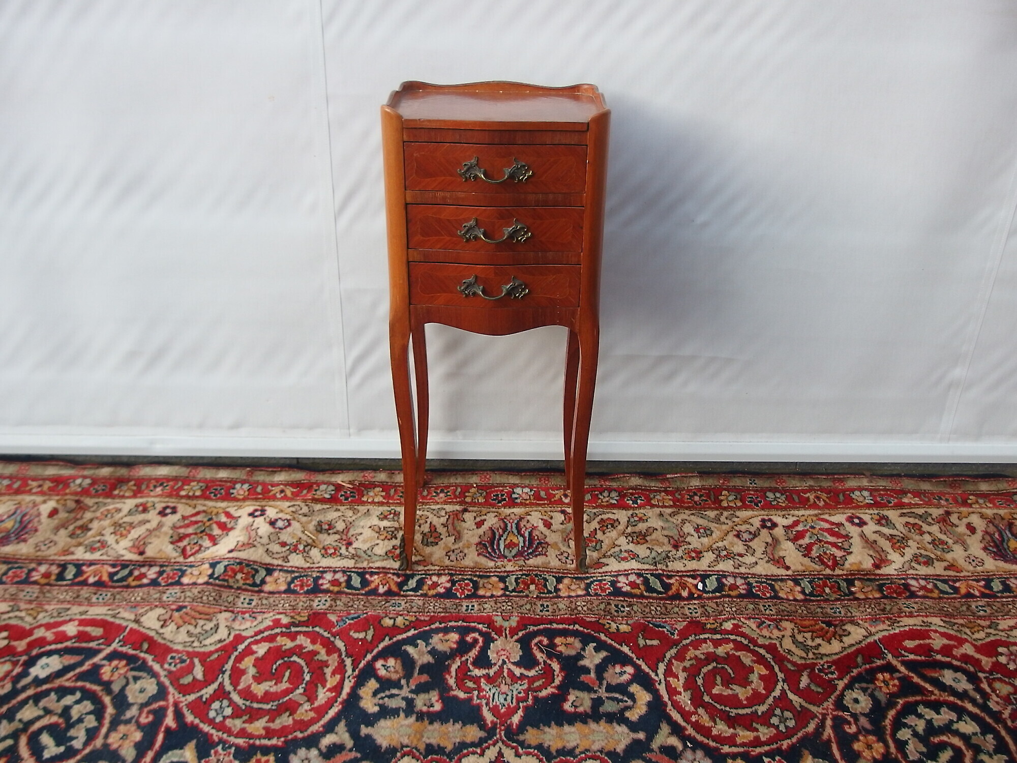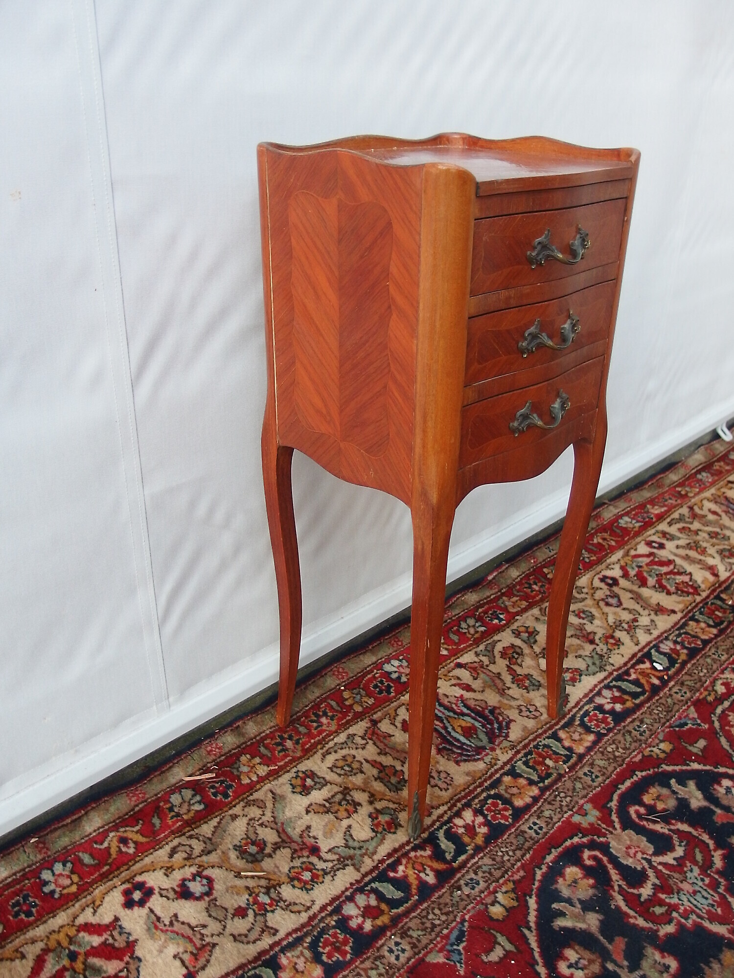 Simpatico comodino di piccole dimensioni a tre cassetti stile Napoleone III intarsiato in legno di rosa epoca primi 900 di origine francese.