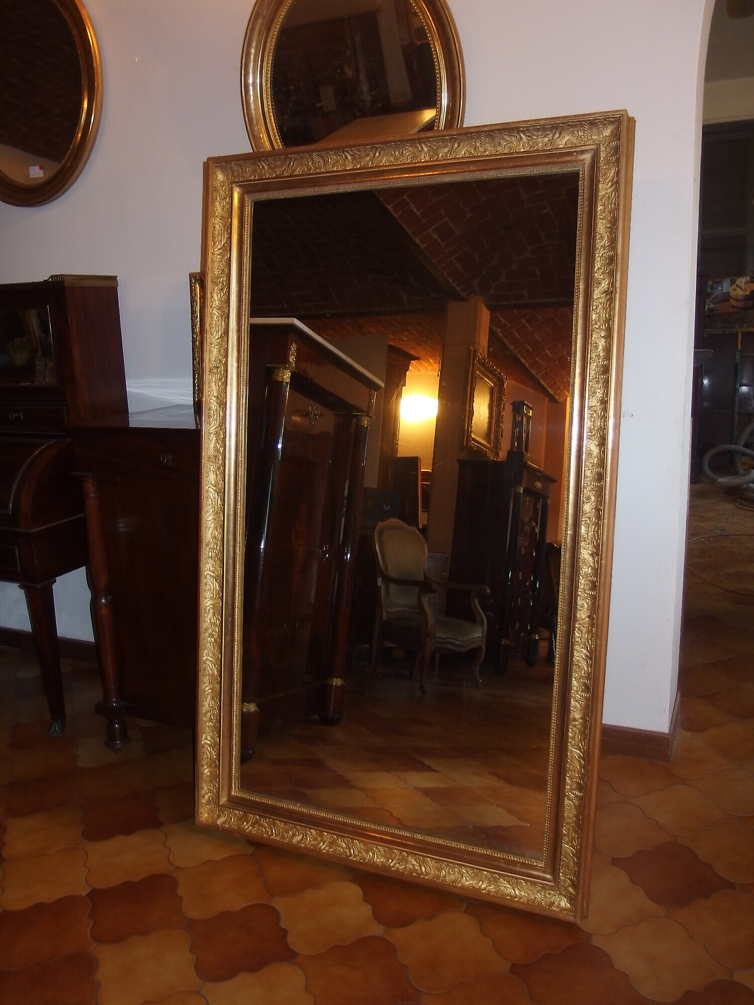 Bellissima specchiera restaurata in legno dorato con lavorazioni in stucco, stile Impero epoca metà 800 di origine francese.
