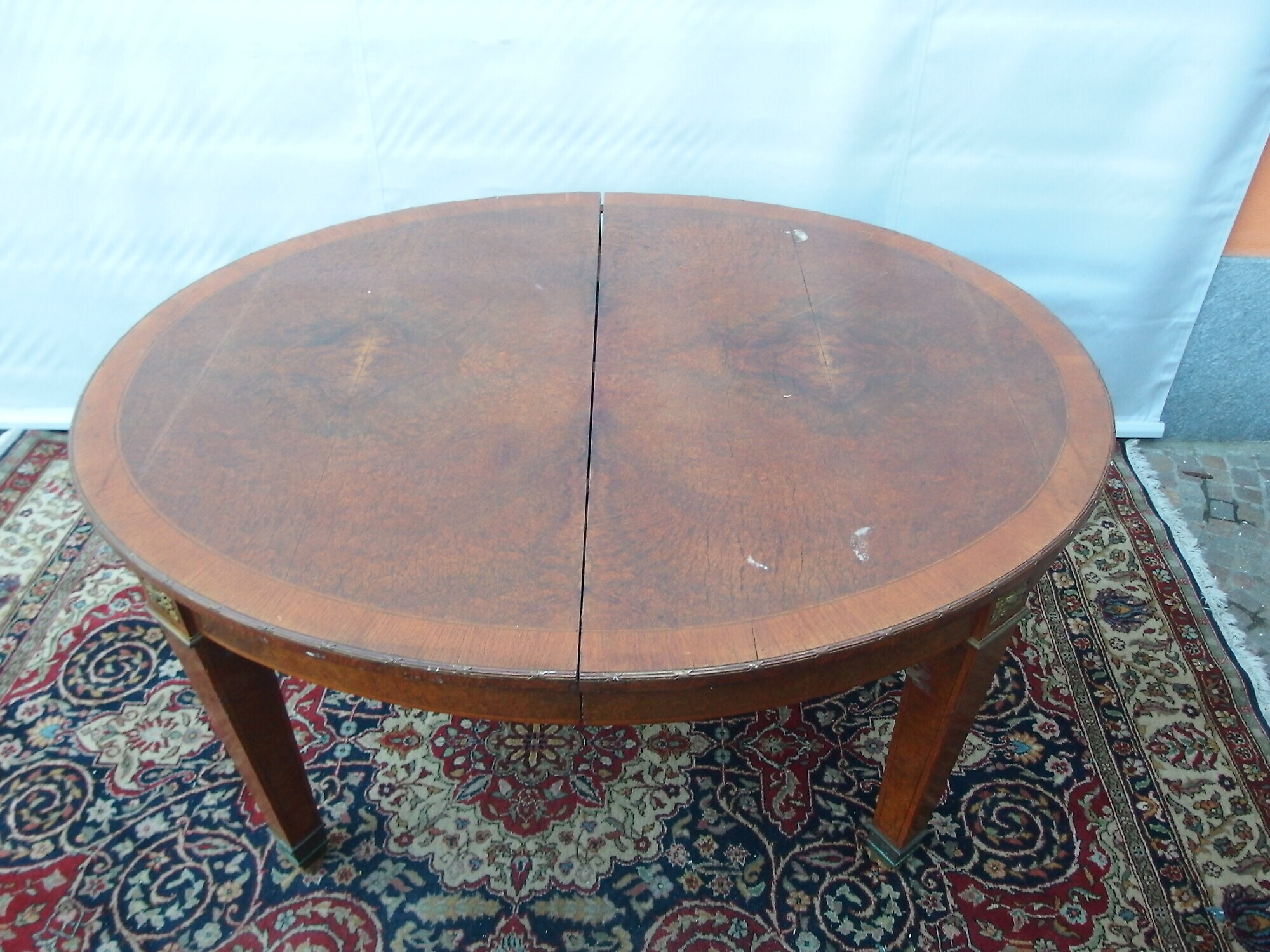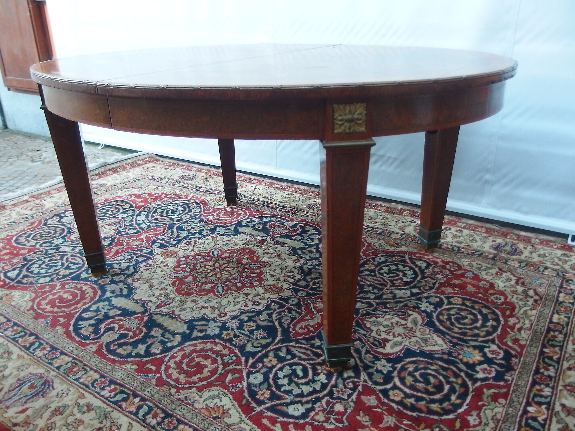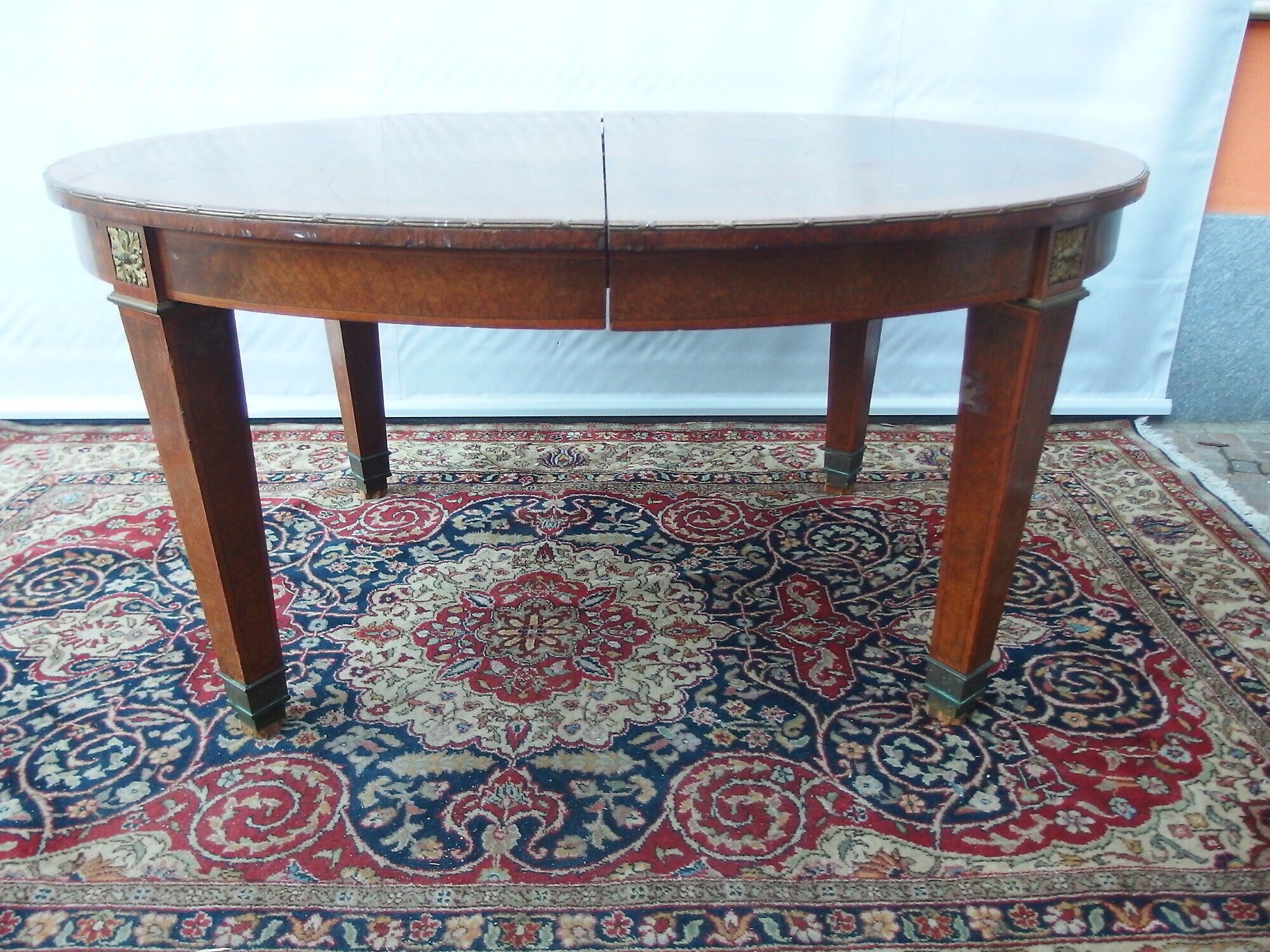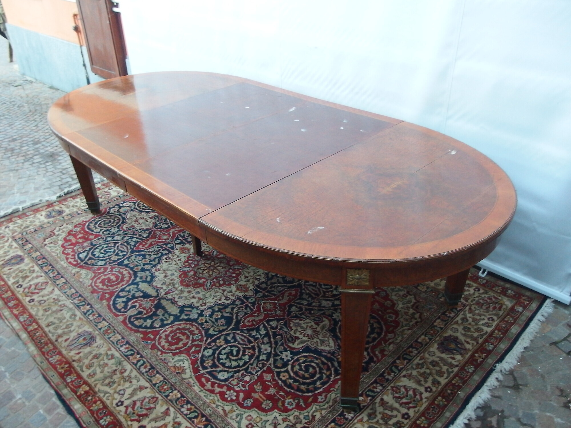 Bellissimo tavolo ovale in legno di noce impiallicciato con radica, allungabile con due prolunghe stile Luigi XVI con gambe a tronco di piramide, arricchito da bronzi. Epoca seconda metà 800 di provenienza francese.