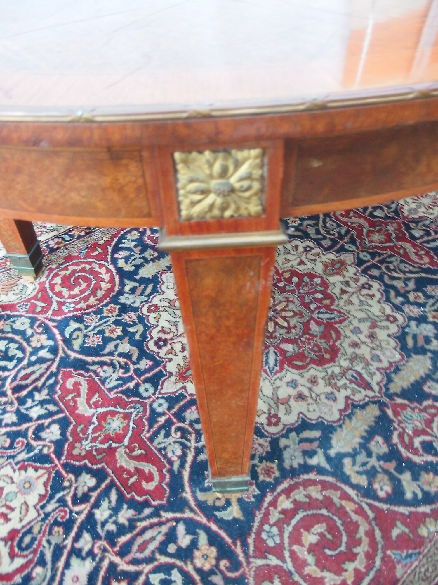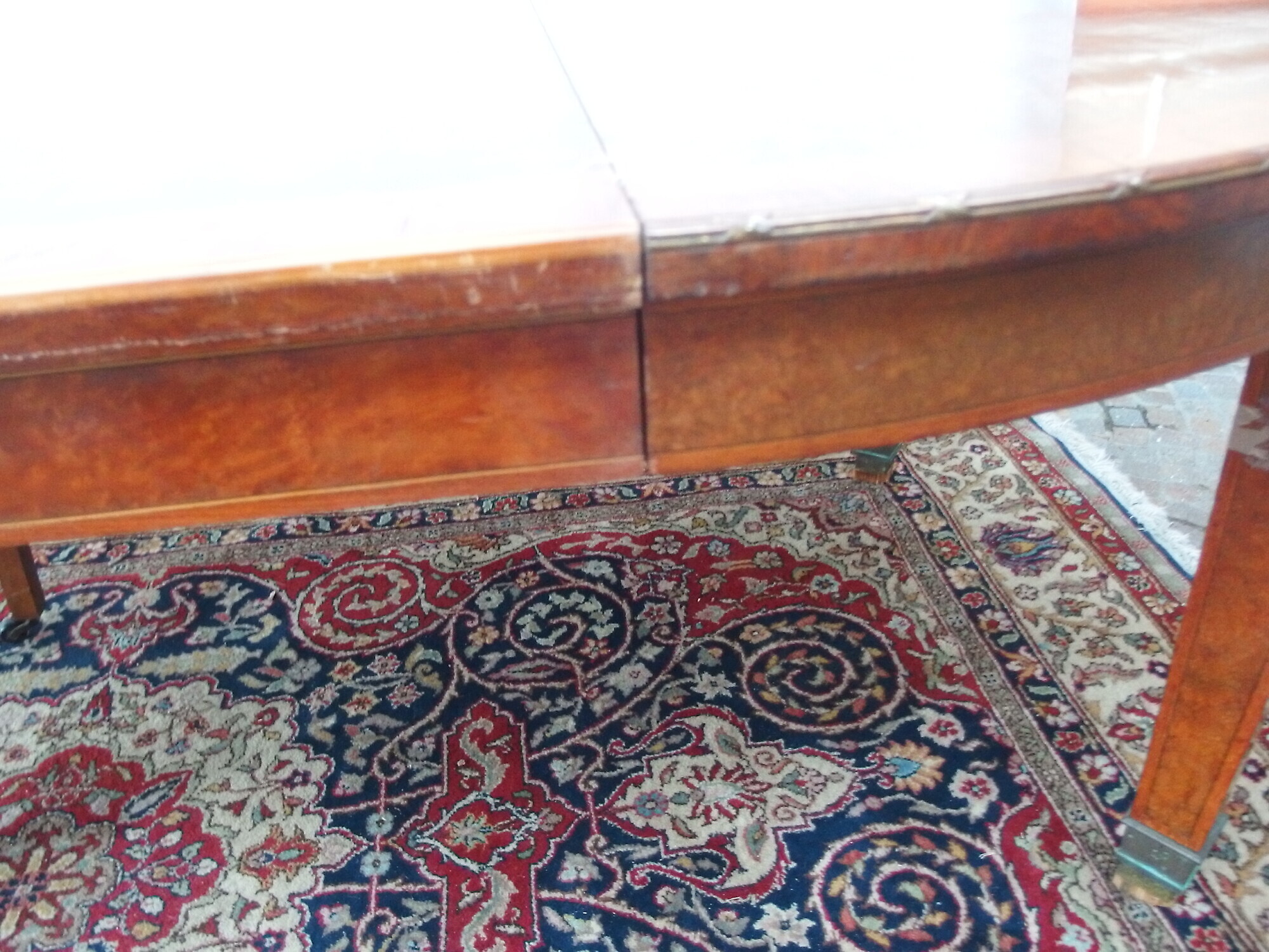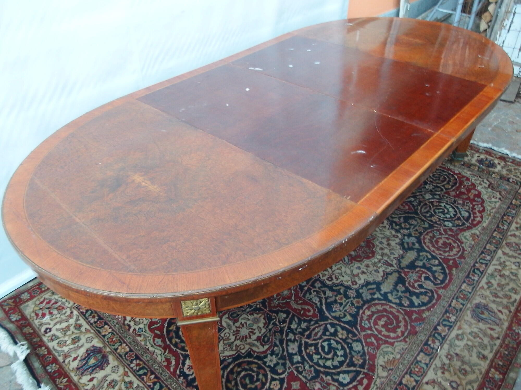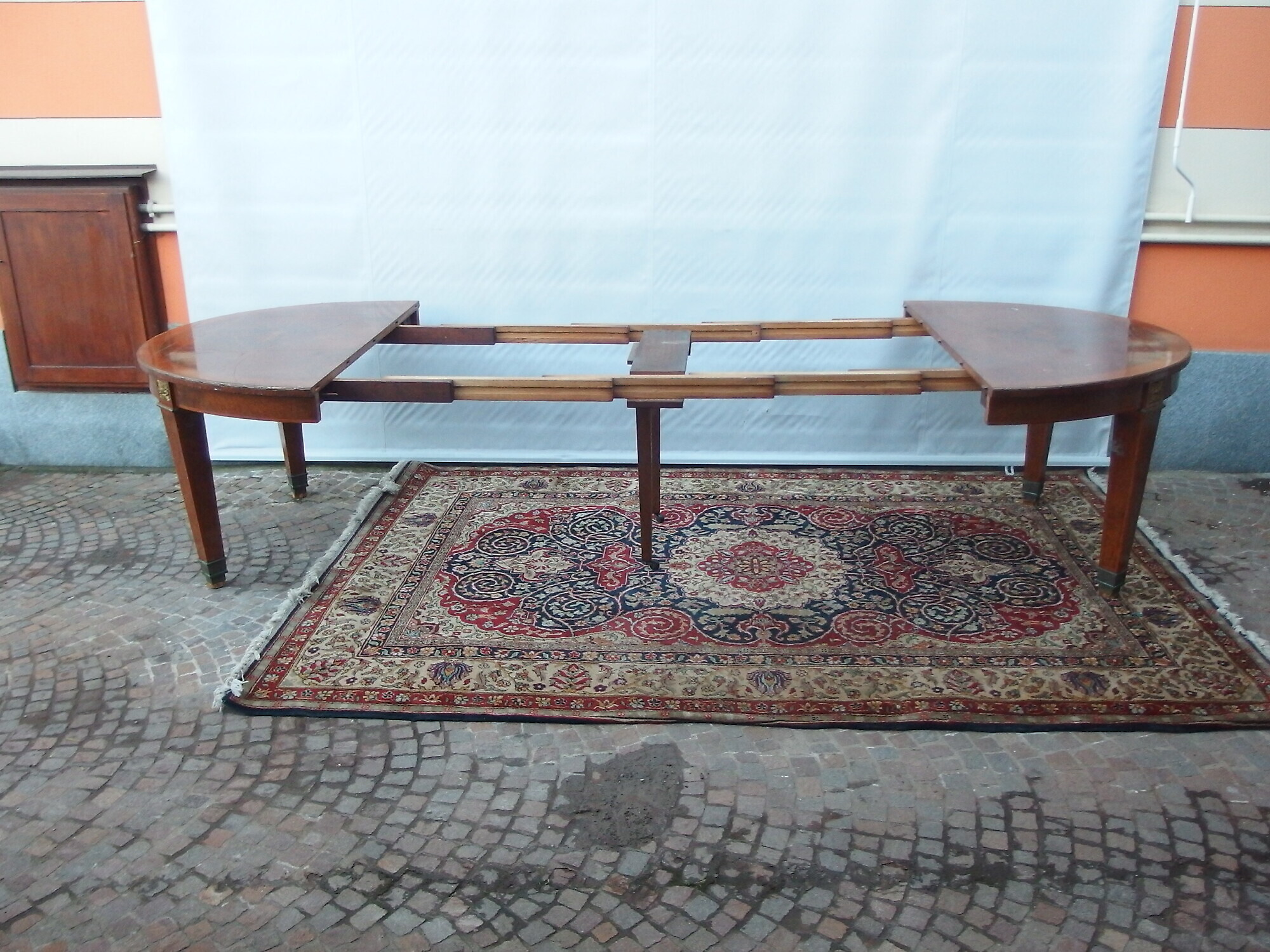 Bellissimo tavolo ovale in legno di noce impiallicciato con radica, allungabile con due prolunghe stile Luigi XVI con gambe a tronco di piramide, arricchito da bronzi. Epoca seconda metà 800 di provenienza francese.